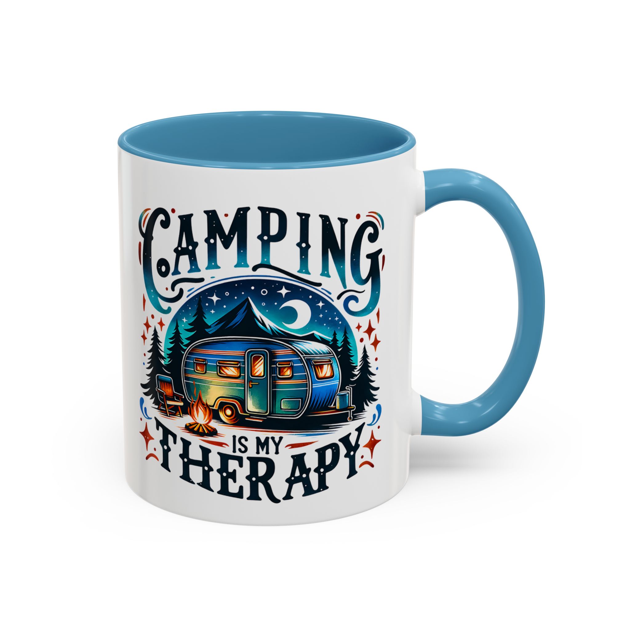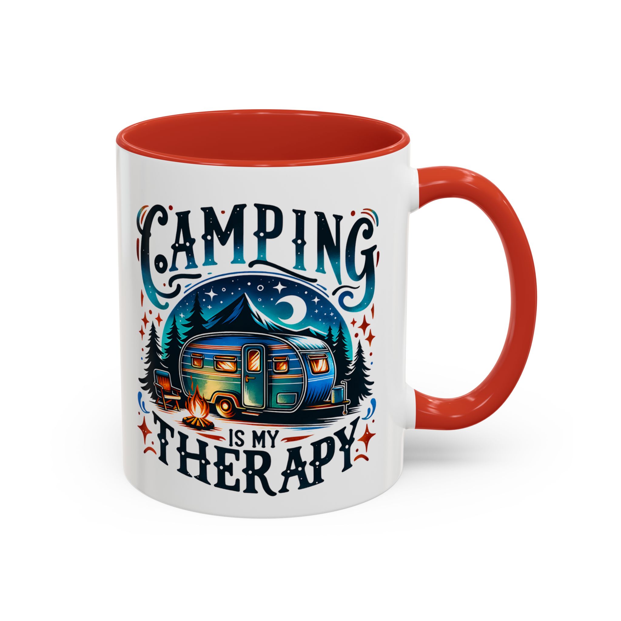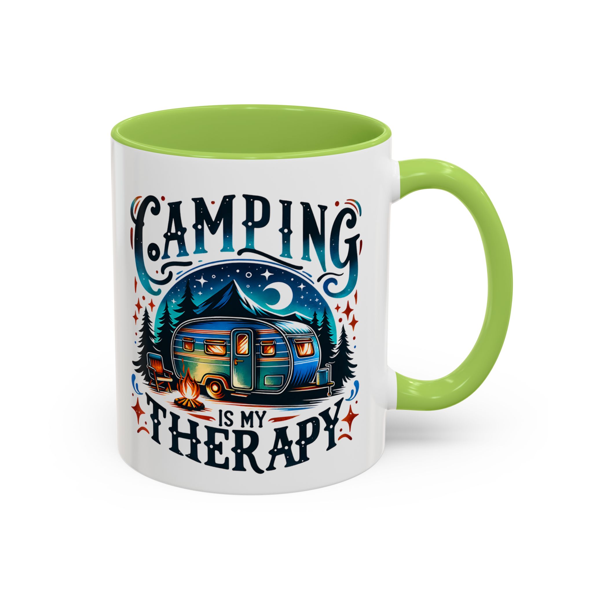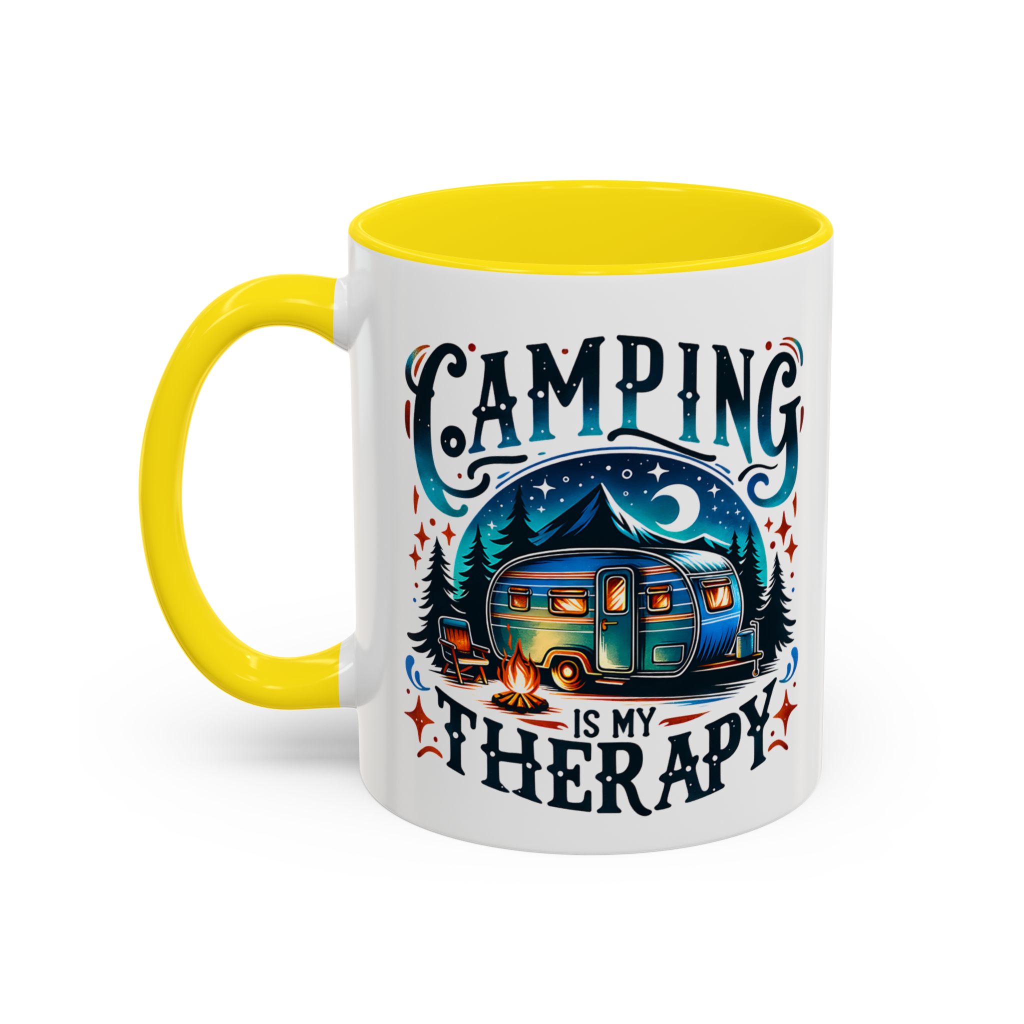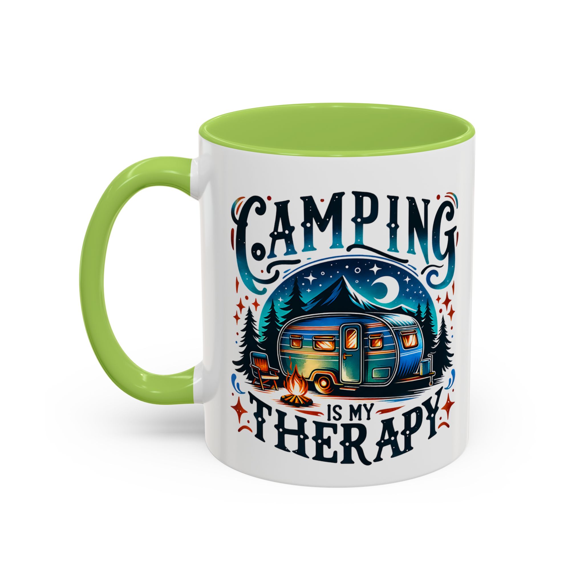 This ceramic accent mug brings a little campsite calm to every sip. The bright, detailed illustration — a glowing camper beneath a starlit sky with the words “Camping is my therapy” — feels like a warm evening around the fire. Smooth glossy white ceramic contrasts with the colored handle and interior, making the artwork pop. It’s sized for morning coffee or a long, slow tea break and stands up to daily use: microwave and dishwasher safe, lead- and BPA-free. Give someone (or yourself) a quiet reminder to slow down and breathe between trips and errands.