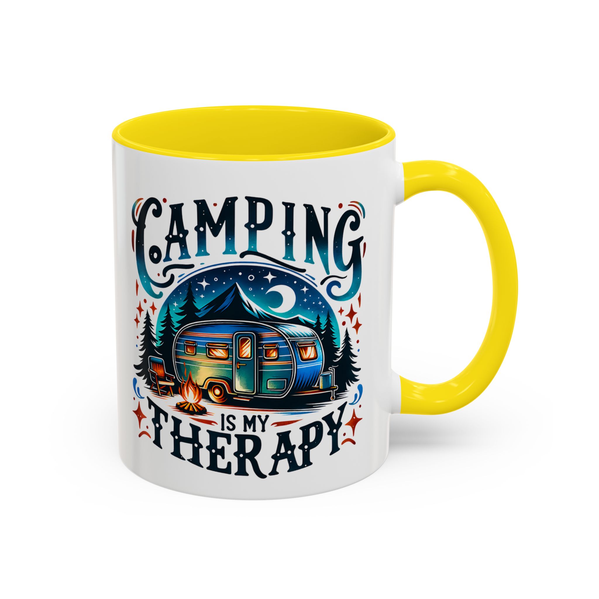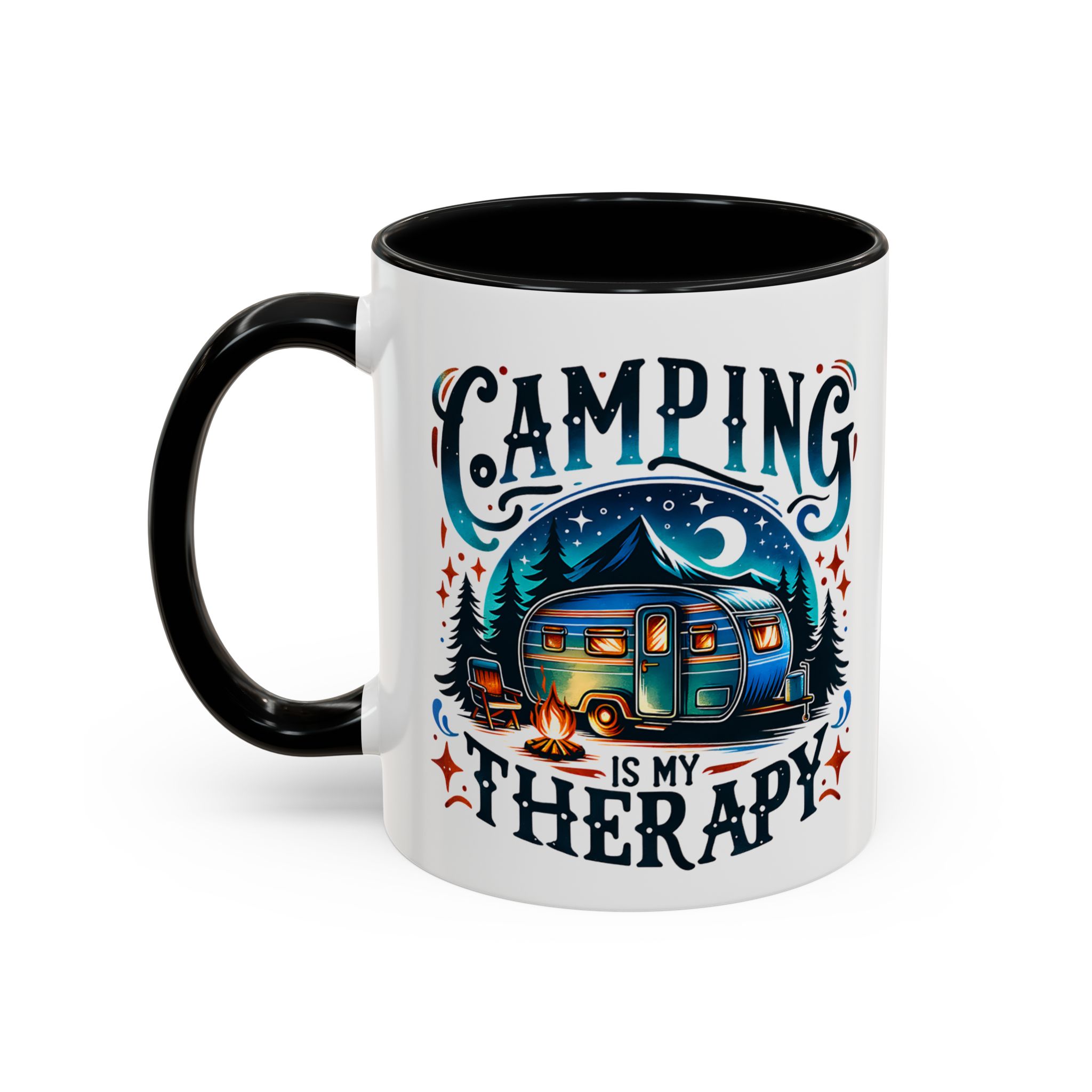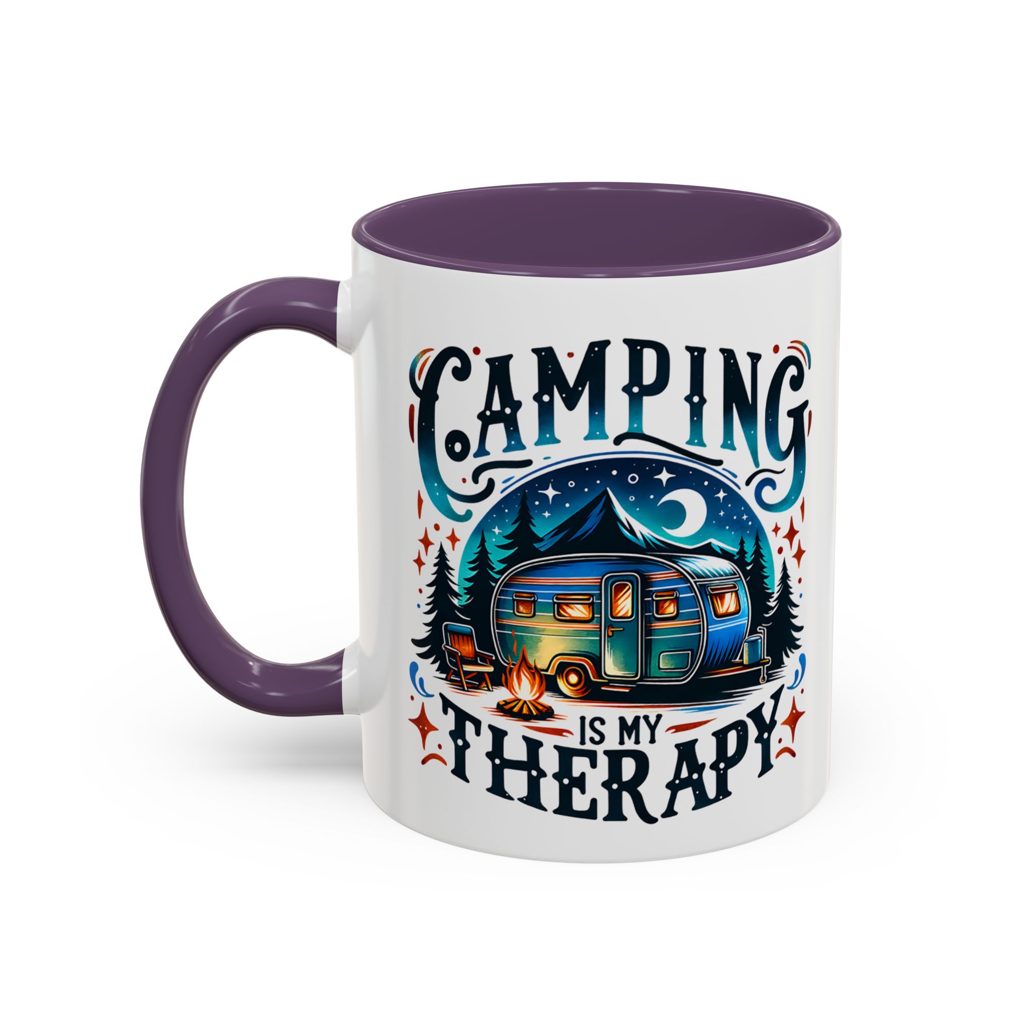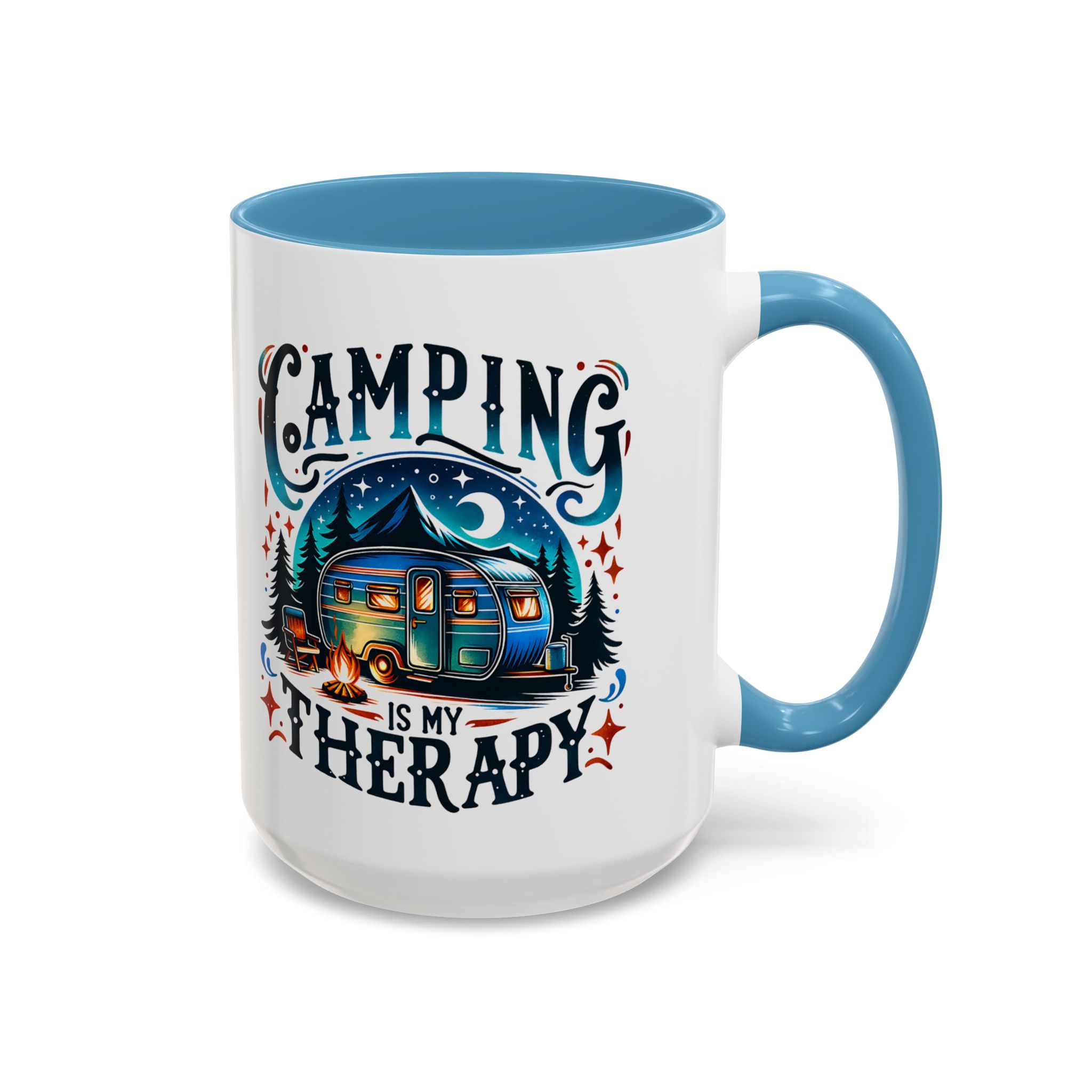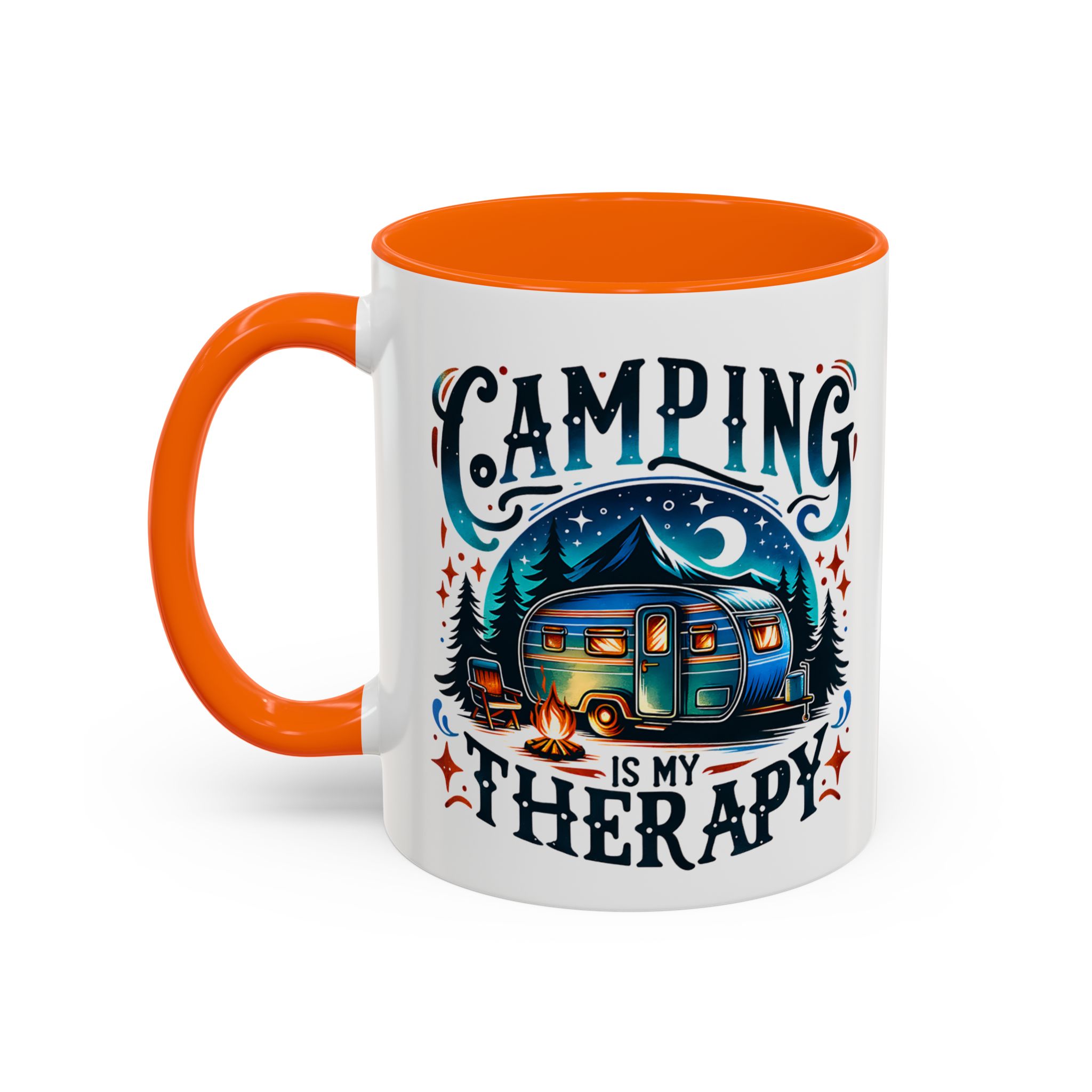 This ceramic accent mug brings a little campsite calm to every sip. The bright, detailed illustration — a glowing camper beneath a starlit sky with the words “Camping is my therapy” — feels like a warm evening around the fire. Smooth glossy white ceramic contrasts with the colored handle and interior, making the artwork pop. It’s sized for morning coffee or a long, slow tea break and stands up to daily use: microwave and dishwasher safe, lead- and BPA-free. Give someone (or yourself) a quiet reminder to slow down and breathe between trips and errands.