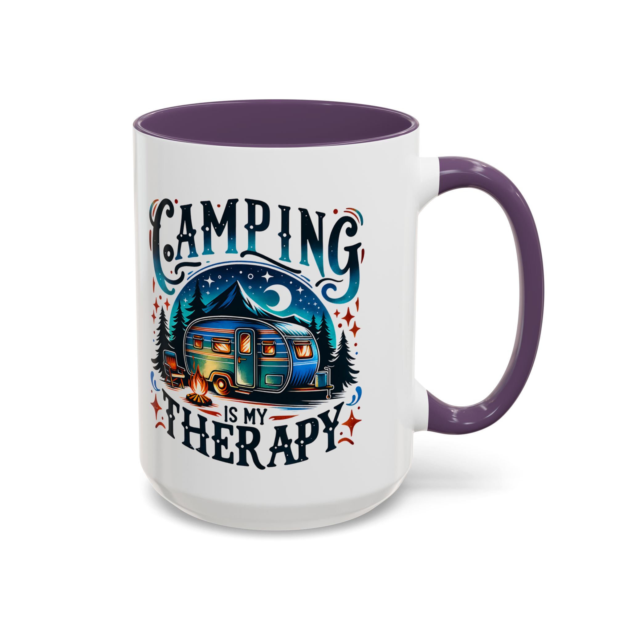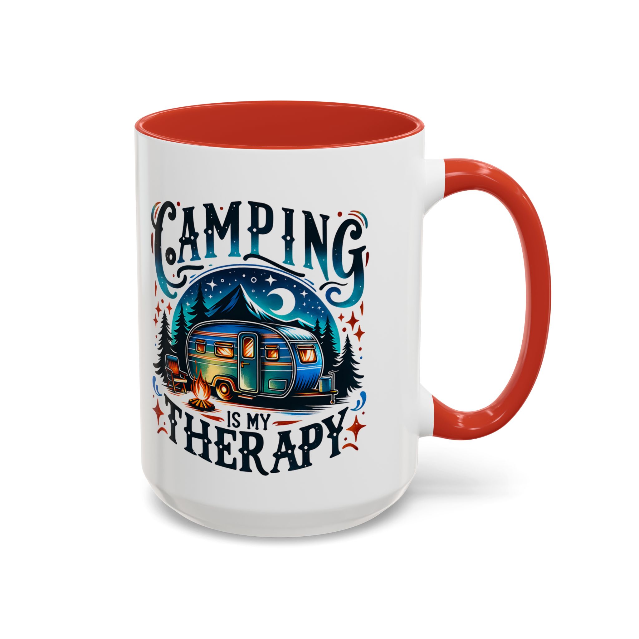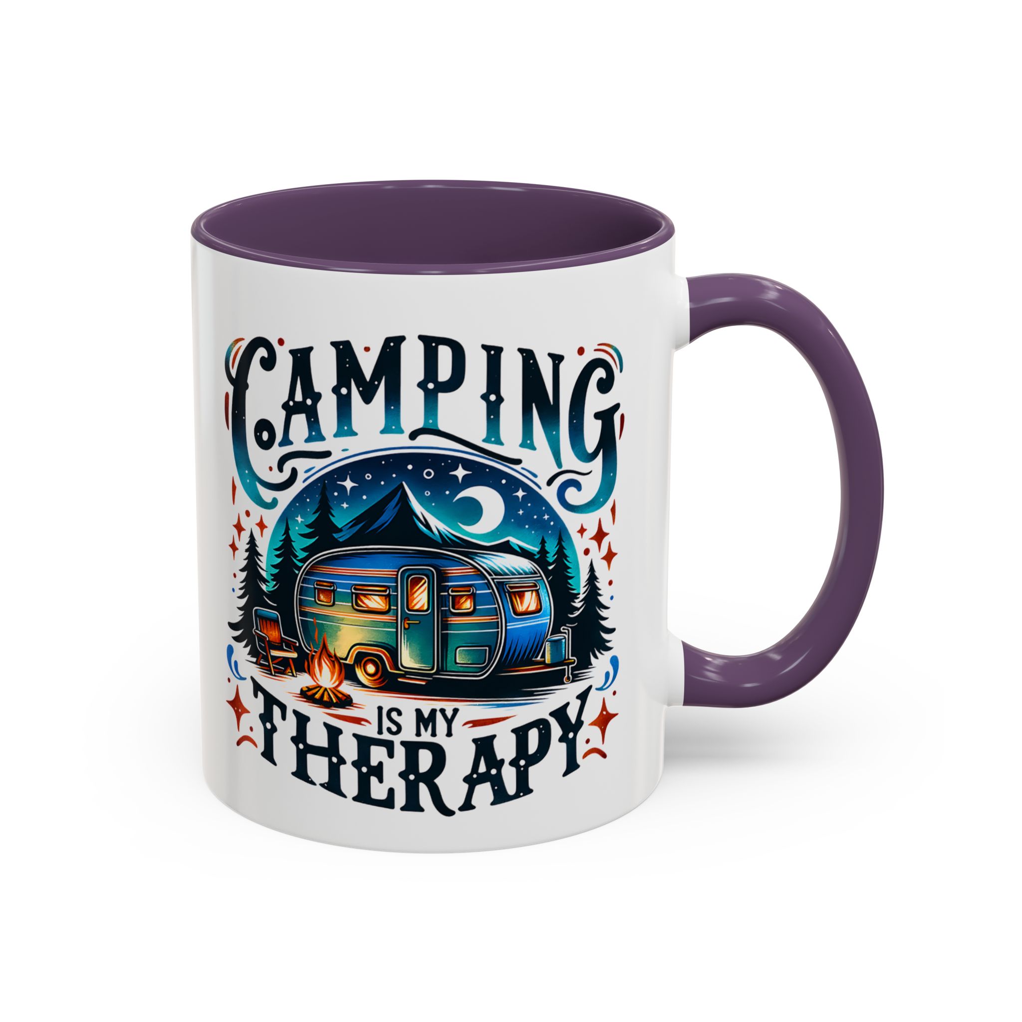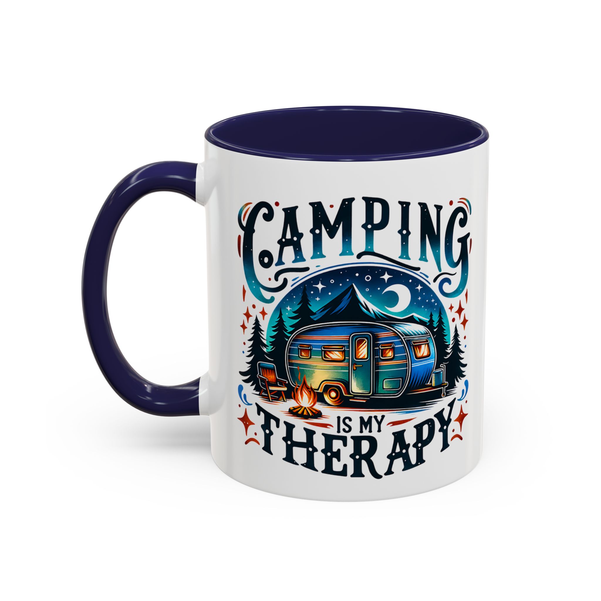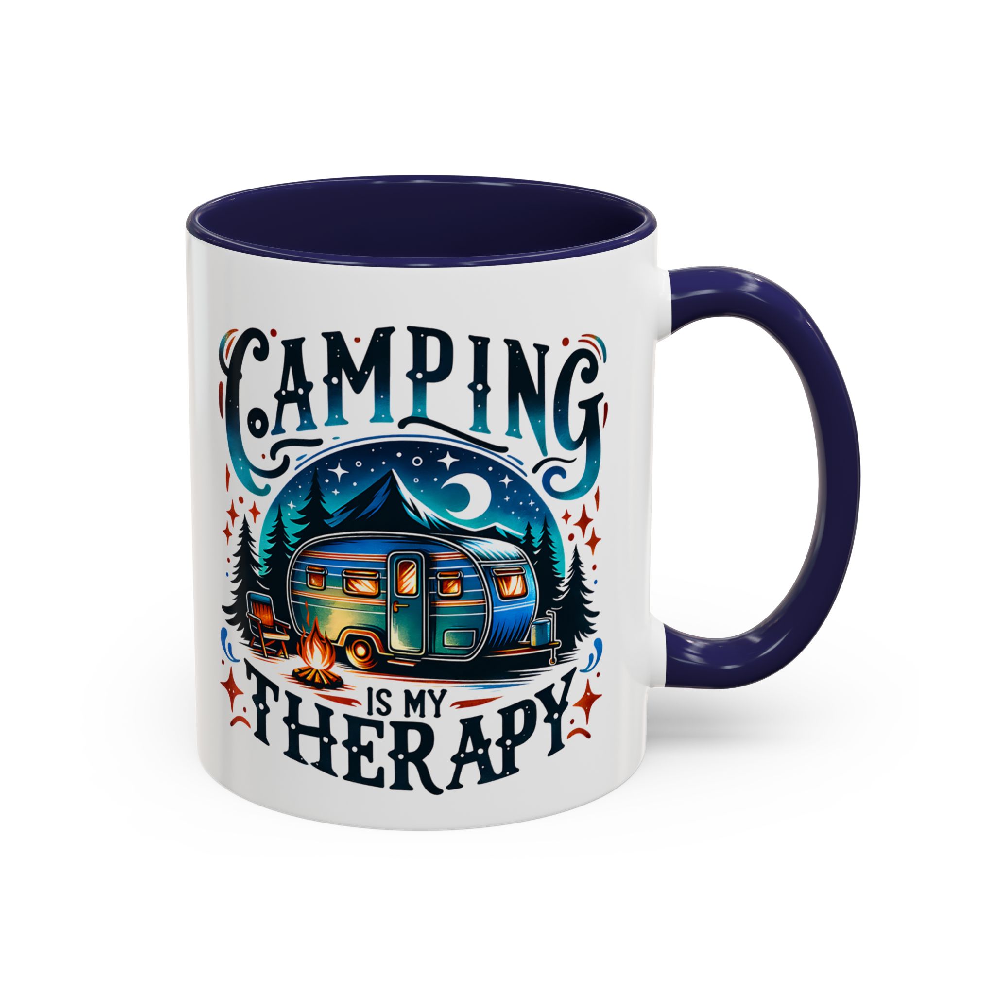 This ceramic accent mug brings a little campsite calm to every sip. The bright, detailed illustration — a glowing camper beneath a starlit sky with the words “Camping is my therapy” — feels like a warm evening around the fire. Smooth glossy white ceramic contrasts with the colored handle and interior, making the artwork pop. It’s sized for morning coffee or a long, slow tea break and stands up to daily use: microwave and dishwasher safe, lead- and BPA-free. Give someone (or yourself) a quiet reminder to slow down and breathe between trips and errands.