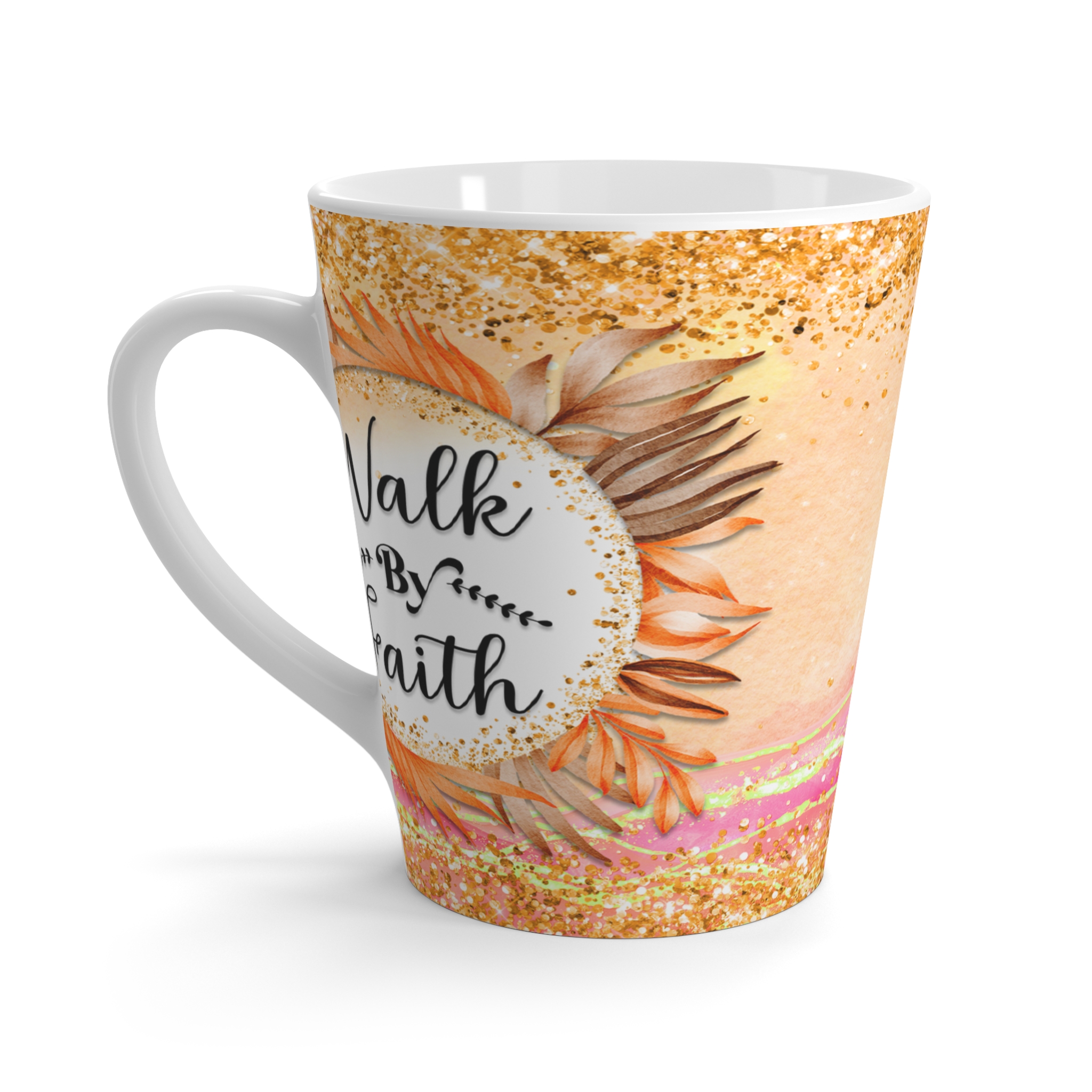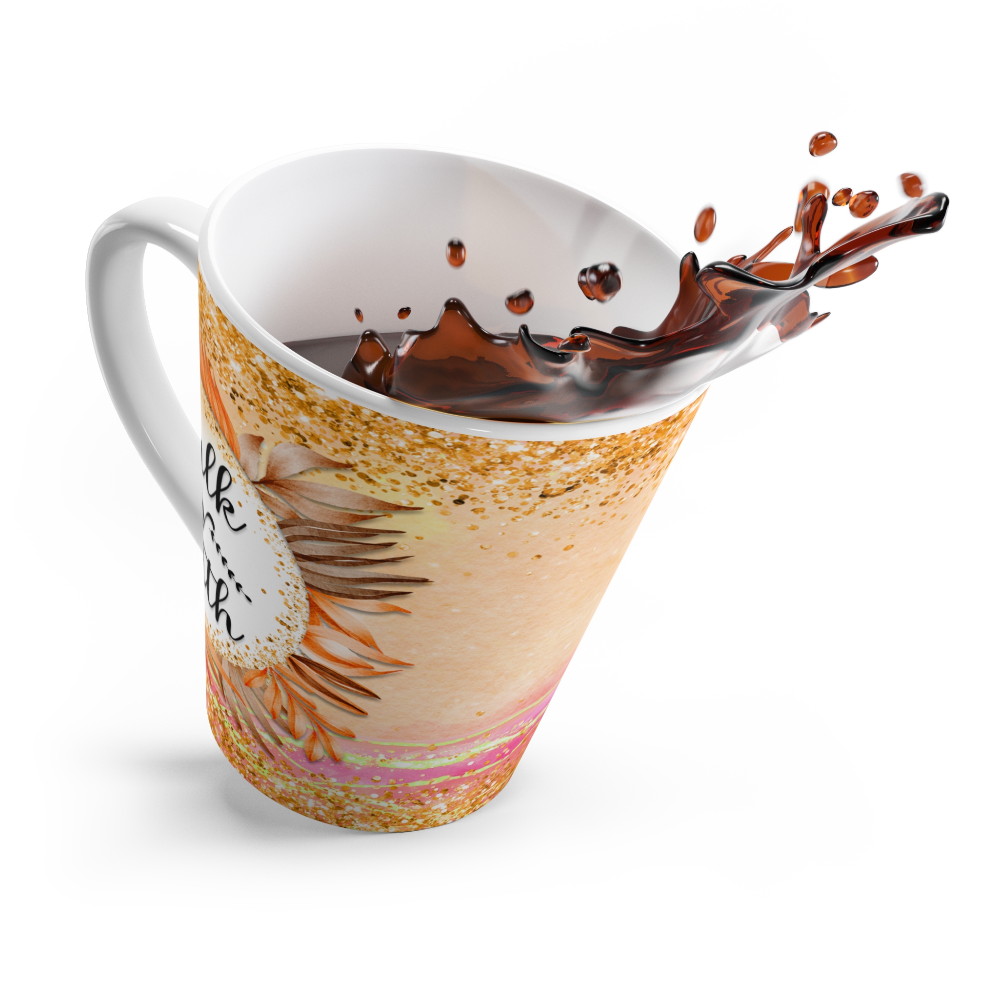 This 12oz white ceramic latte mug brings a warm, sunlit moment to your morning routine. A soft peach and gold watercolor palette wraps around the tapered silhouette, punctuated by a hand-painted sunflower wreath and an encouraging script message. The smooth C-handle and rounded rim make each sip comfortable, while the lightweight ceramic keeps the focus on gentle, everyday ritual. It slips easily into quiet kitchen corners and busy desks alike — a small reminder to move forward with calm and confidence.